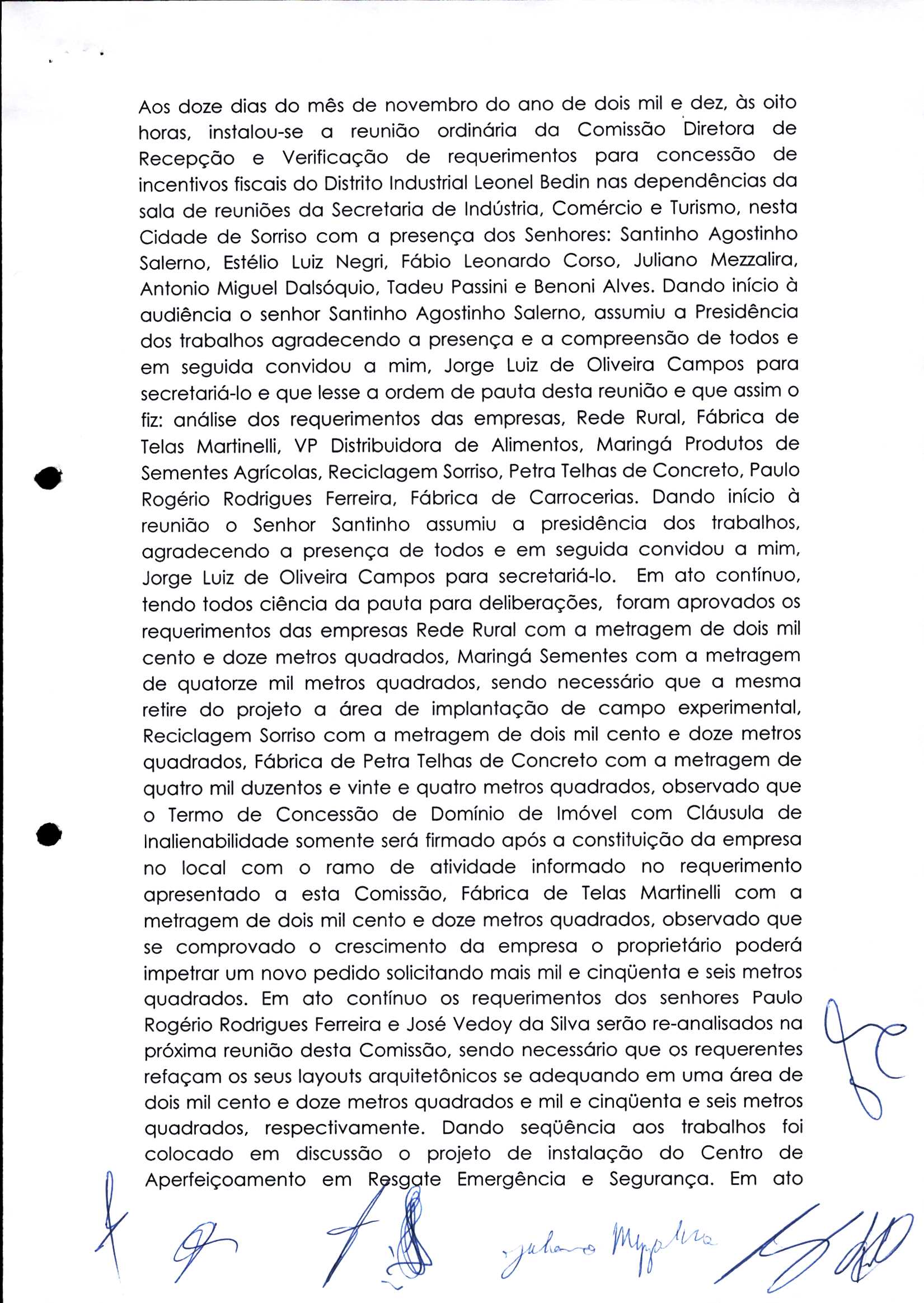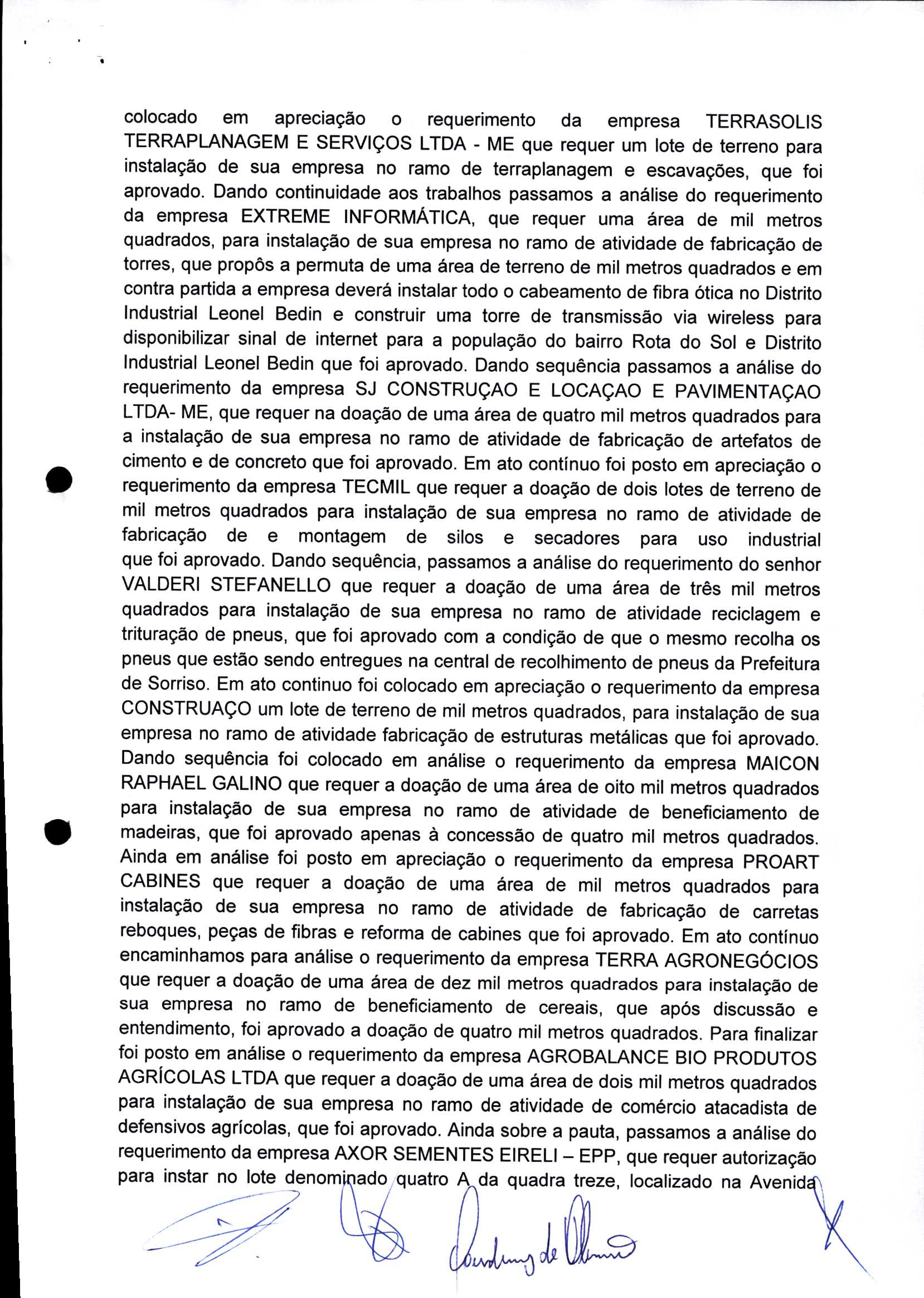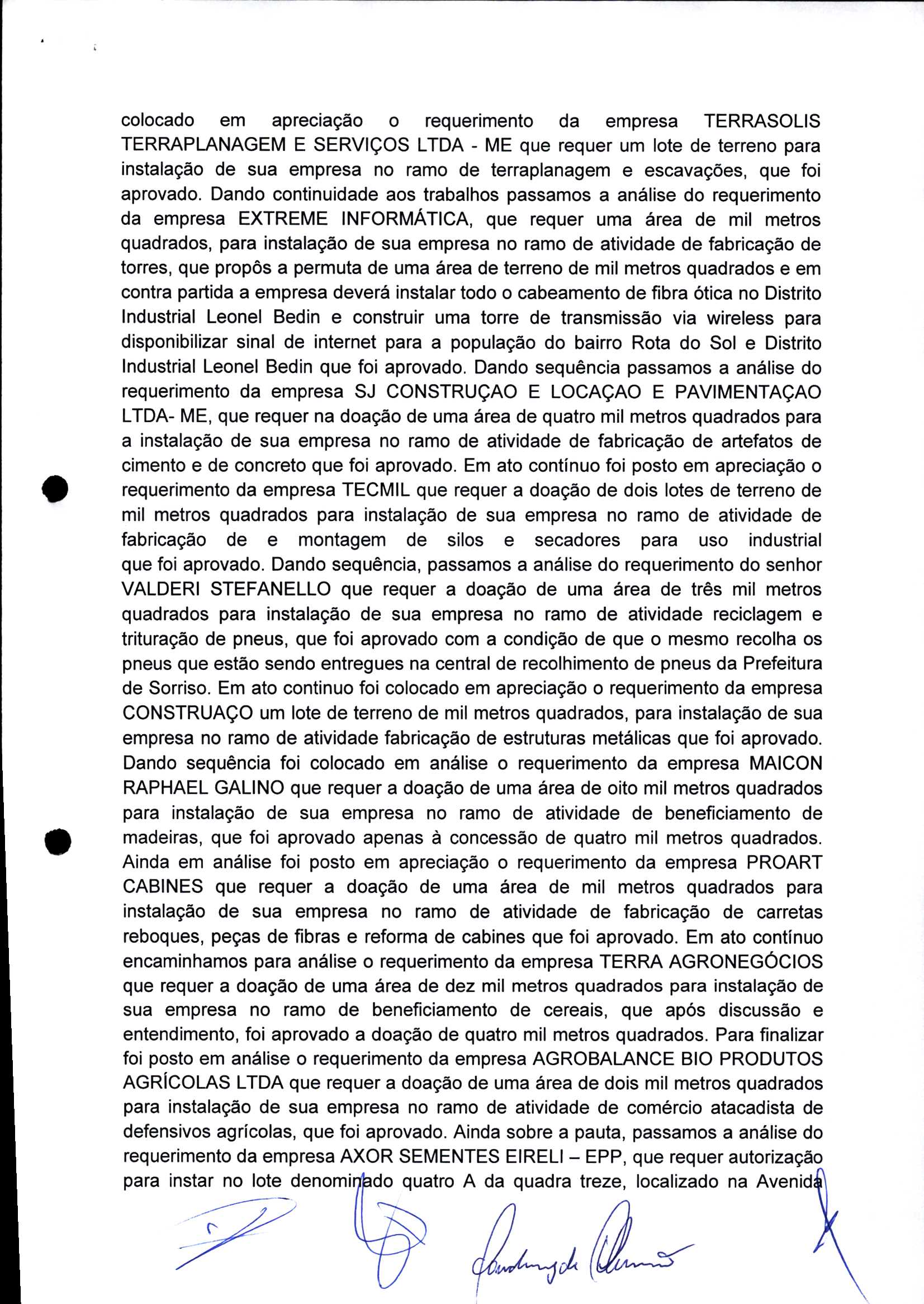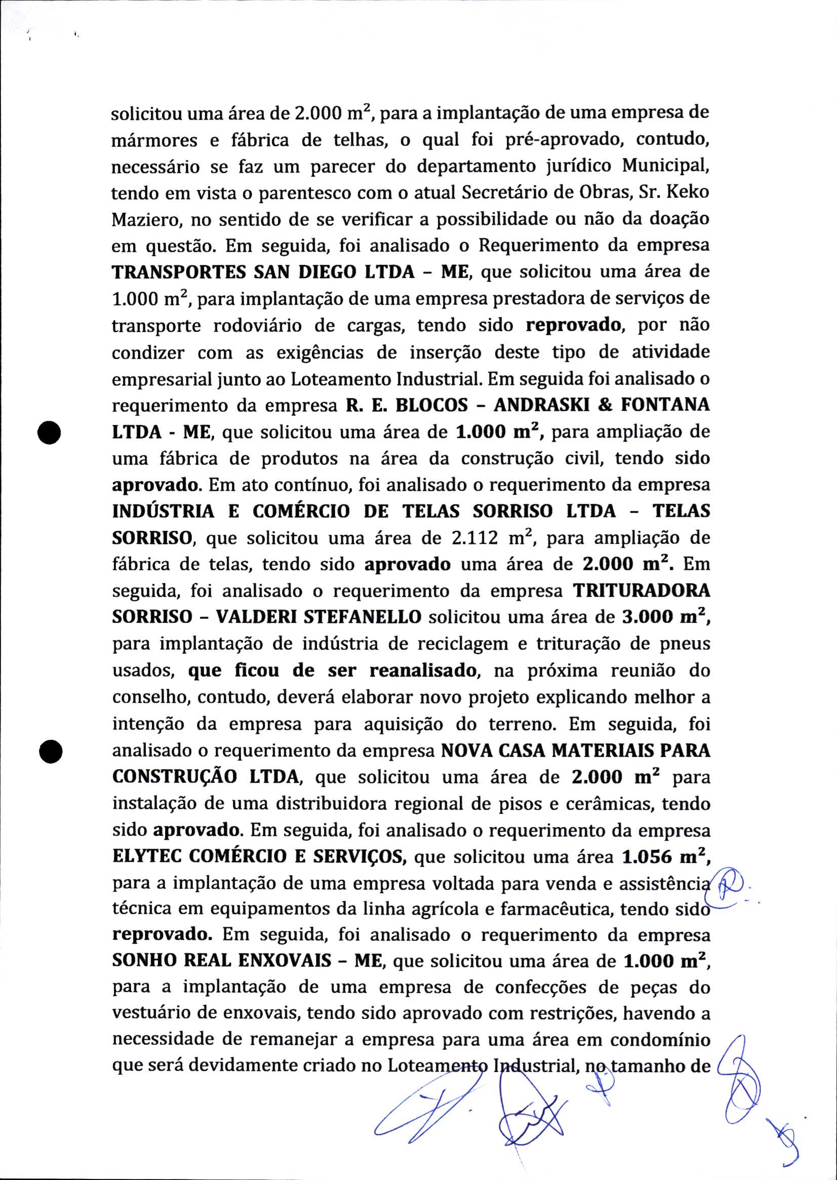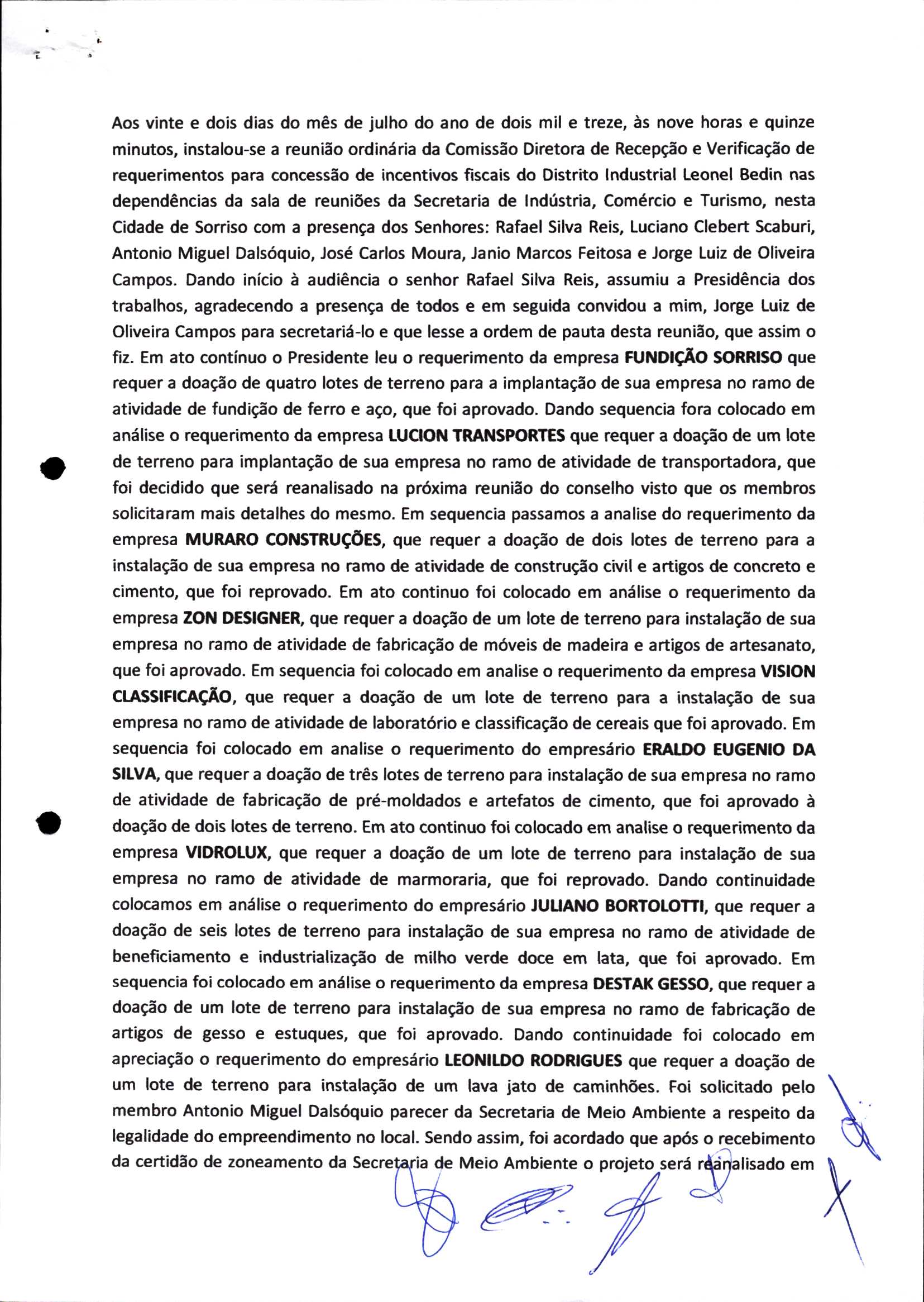 | Requerimento Nº 289/2023 | 04/10/2023 | requerendo as seguintes informações: a) Relação de todas as empresas contempladas com doação de imóveis junto ao Distrito Industrial Leonel Bedin I e II; b) Relação de todas as empresas instaladas no Distrito Industrial Leonel Bedin I que obtiveram autorização para escrituração dos imóveis, discriminadas por cumprimento do prazo e por antecipação de escritura; c) Cópias de todas as atas de reunião da Comissão Diretora de Verificação e de Recepção dos Requerimentos no período de 2017 a 2023; d) Justifica de não terem atendido a determinação do TCE/MT exarada no Acórdão nº 270/2021 – TP, vinculado ao processo nº 11.004-3/2018 explicita na alínea “h” para que o executivo apresentasse projeto de lei à Câmara Legislativa de Sorriso propondo alterações legislativas no sentido de adequar os textos normativos da Lei Municipal n.º 1.699/2008, com os ditames encartados na tese normativa e vinculativa veiculada pelo Acórdão n.º TCE/MT n.º 659/2006. |