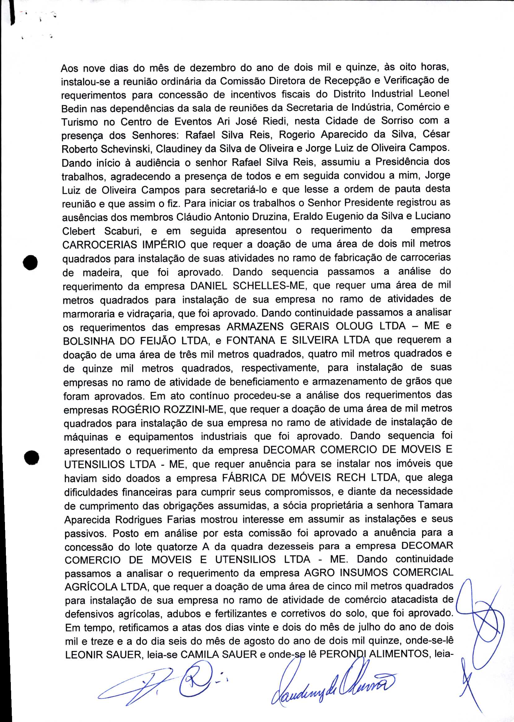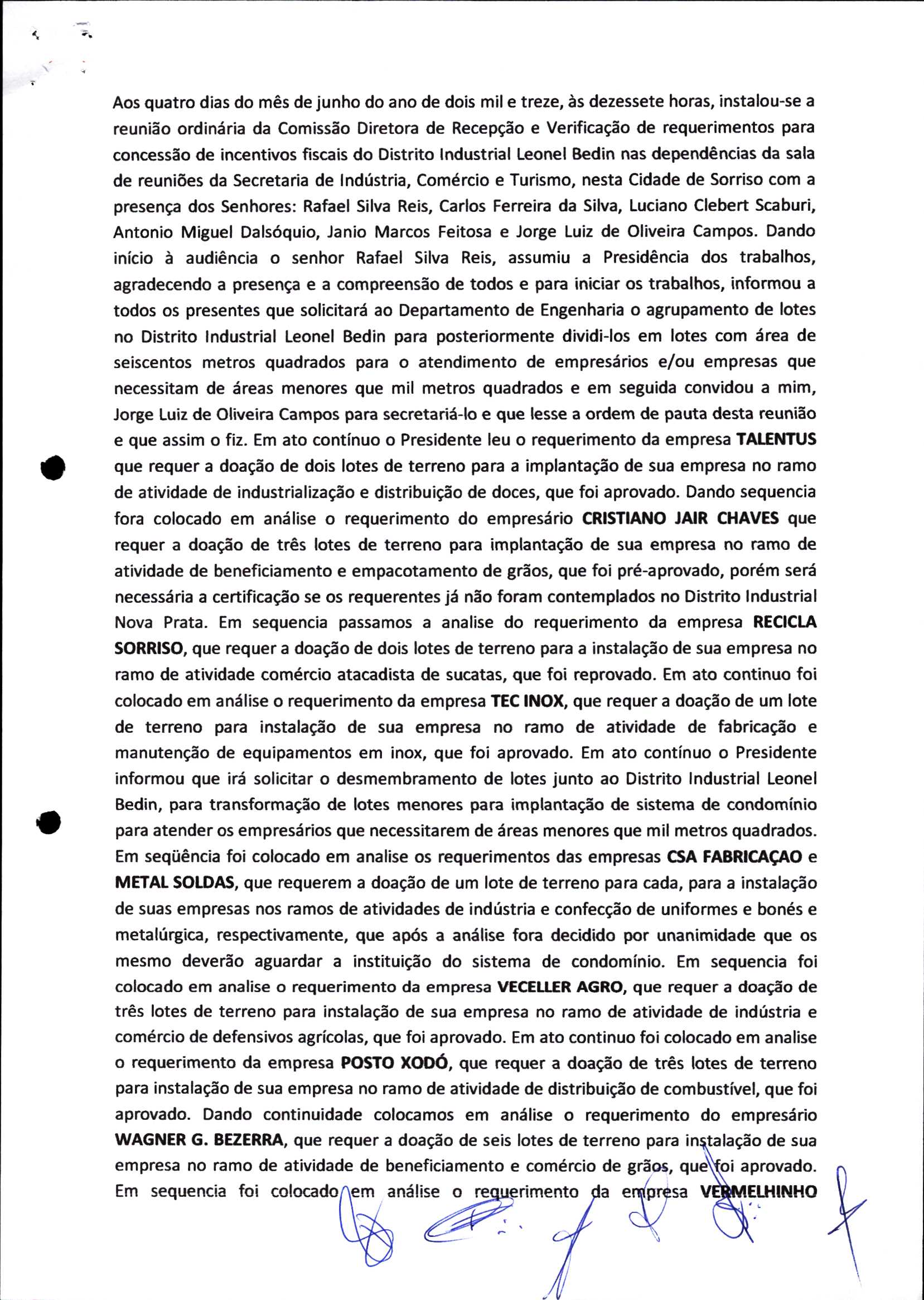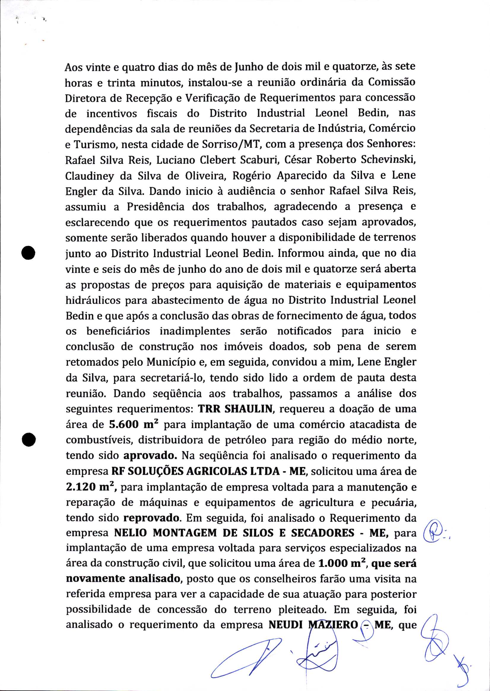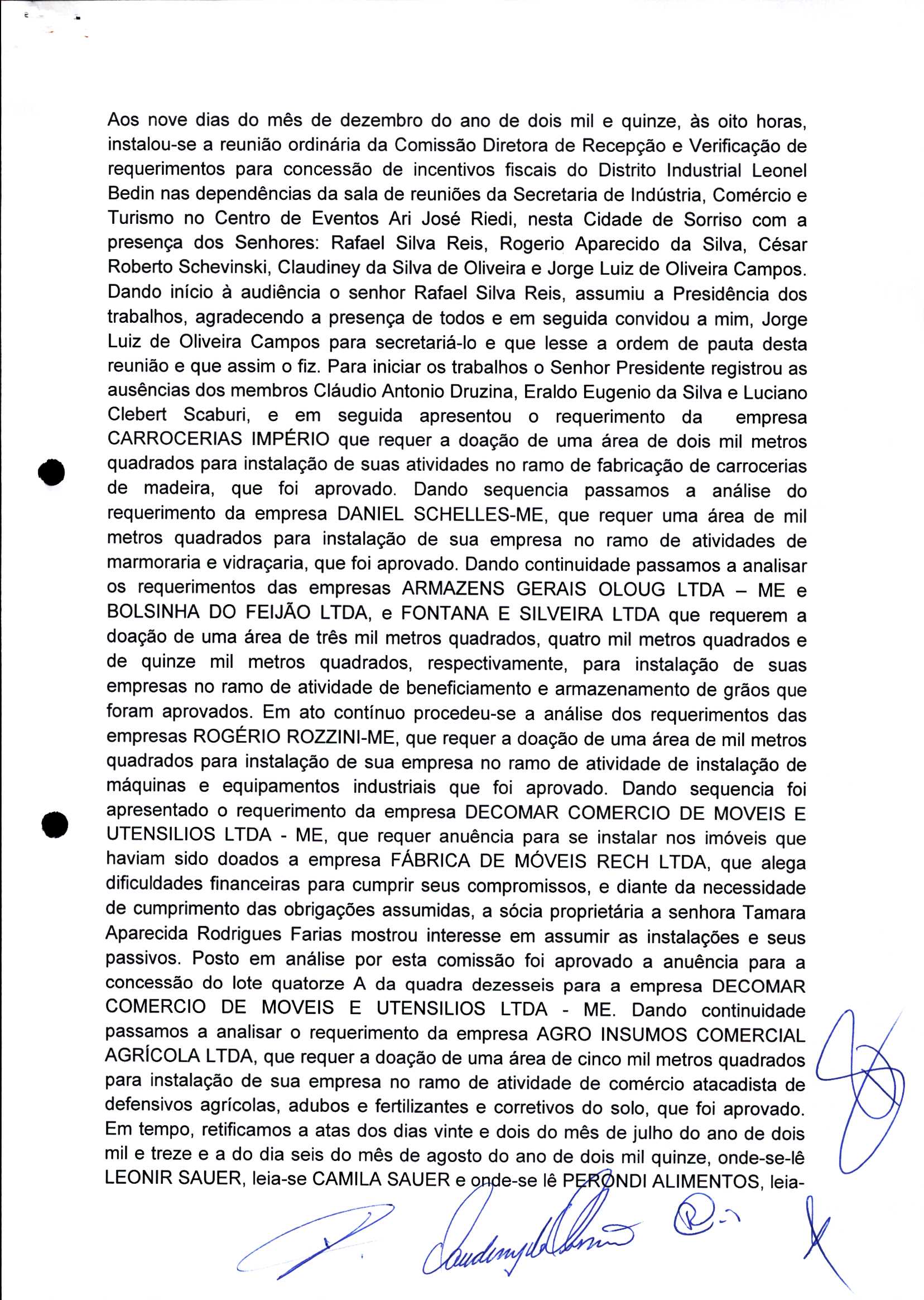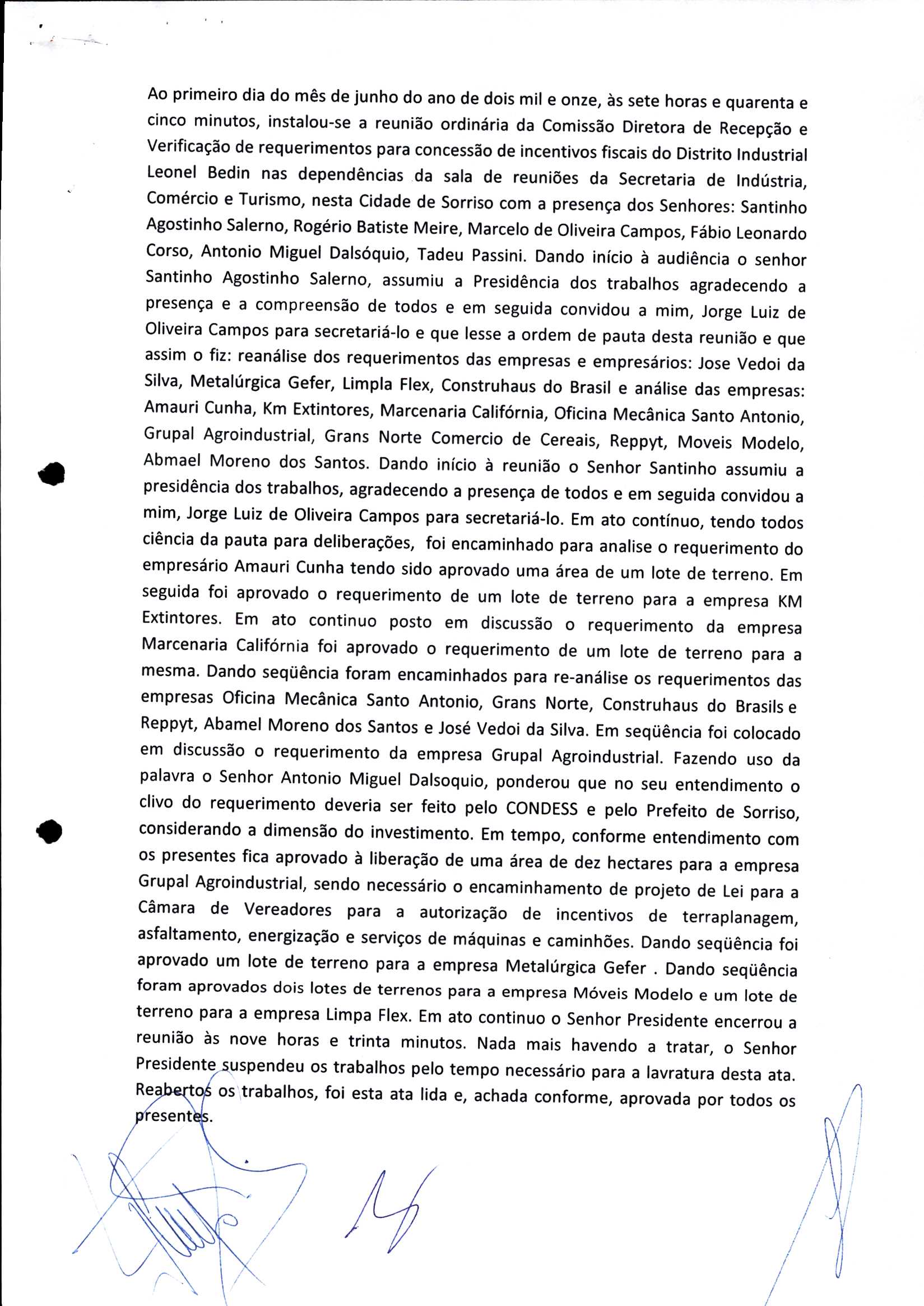 | Requerimento Nº 289/2023 | 04/10/2023 | requerendo as seguintes informações: a) Relação de todas as empresas contempladas com doação de imóveis junto ao Distrito Industrial Leonel Bedin I e II; b) Relação de todas as empresas instaladas no Distrito Industrial Leonel Bedin I que obtiveram autorização para escrituração dos imóveis, discriminadas por cumprimento do prazo e por antecipação de escritura; c) Cópias de todas as atas de reunião da Comissão Diretora de Verificação e de Recepção dos Requerimentos no período de 2017 a 2023; d) Justifica de não terem atendido a determinação do TCE/MT exarada no Acórdão nº 270/2021 – TP, vinculado ao processo nº 11.004-3/2018 explicita na alínea “h” para que o executivo apresentasse projeto de lei à Câmara Legislativa de Sorriso propondo alterações legislativas no sentido de adequar os textos normativos da Lei Municipal n.º 1.699/2008, com os ditames encartados na tese normativa e vinculativa veiculada pelo Acórdão n.º TCE/MT n.º 659/2006. |