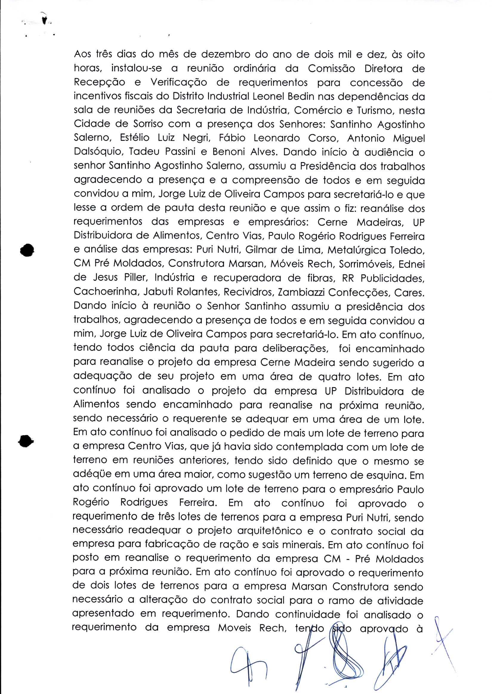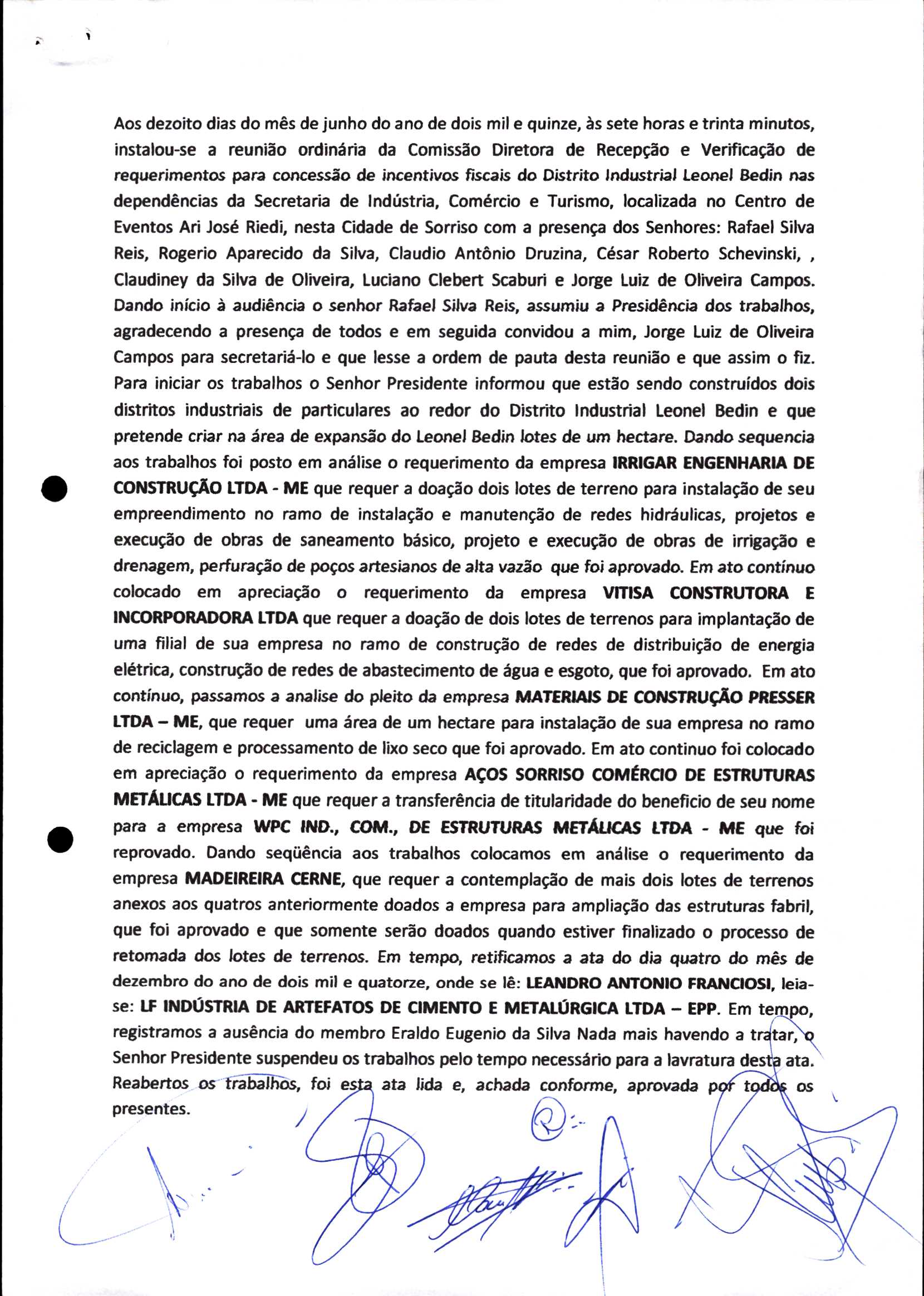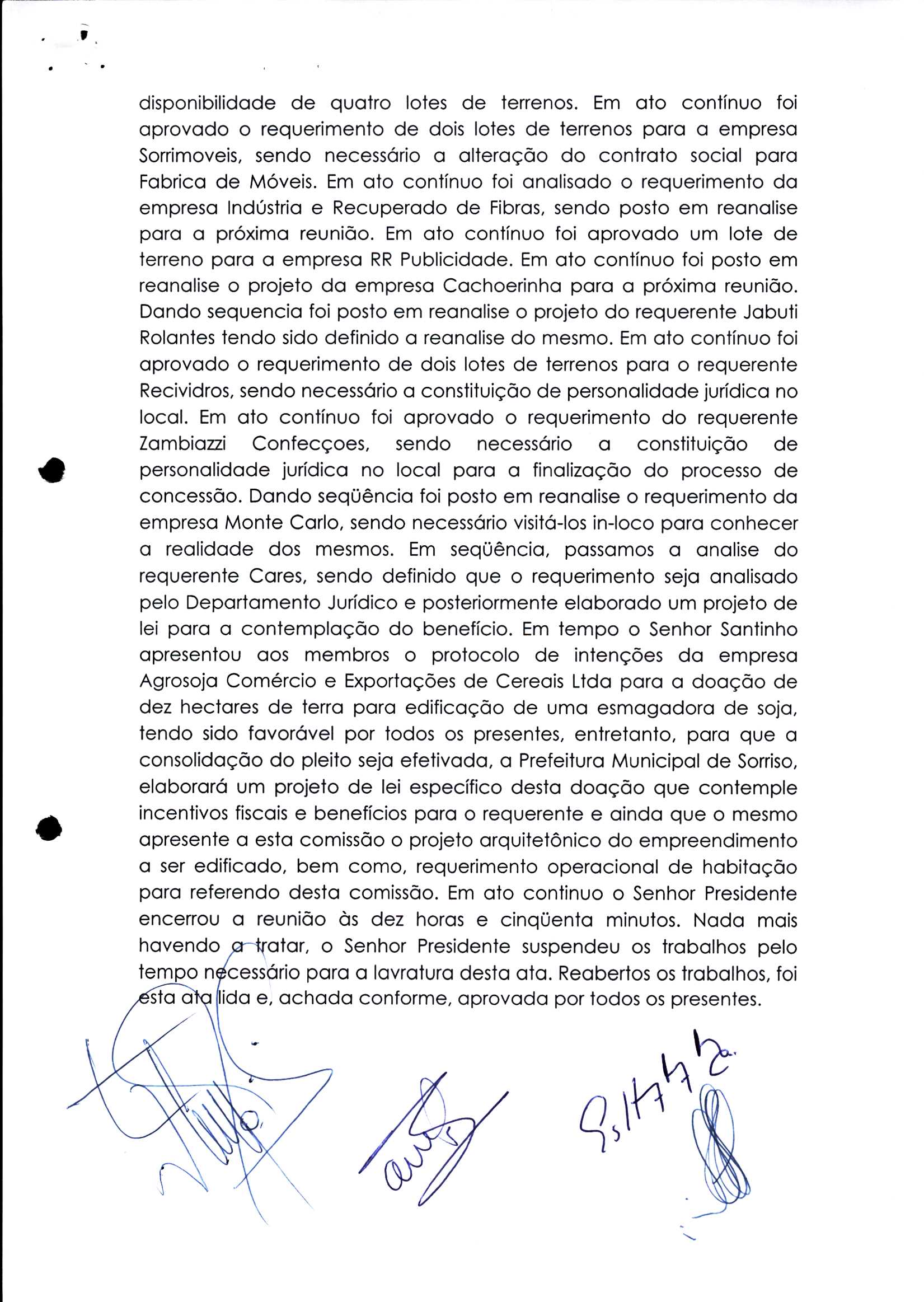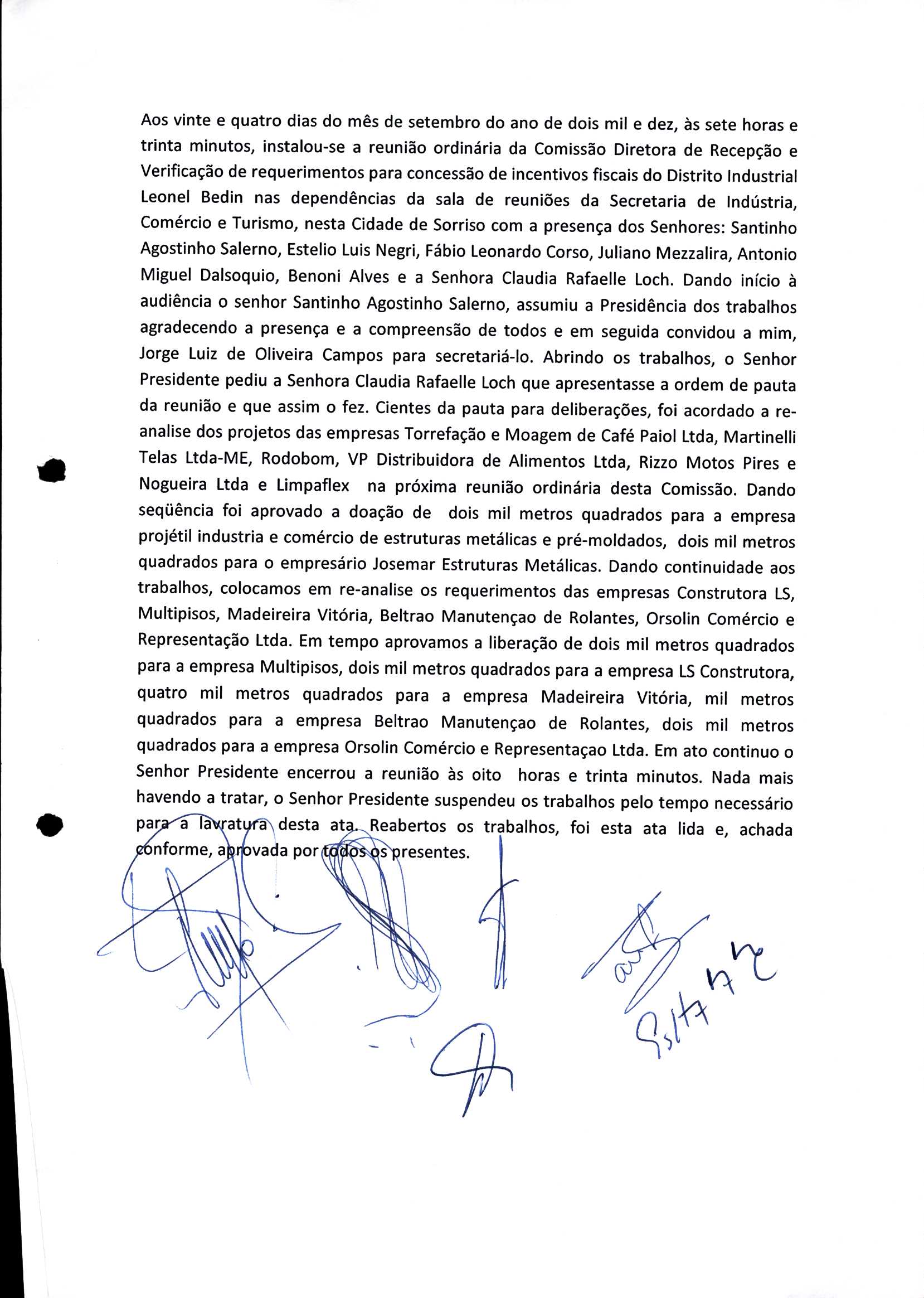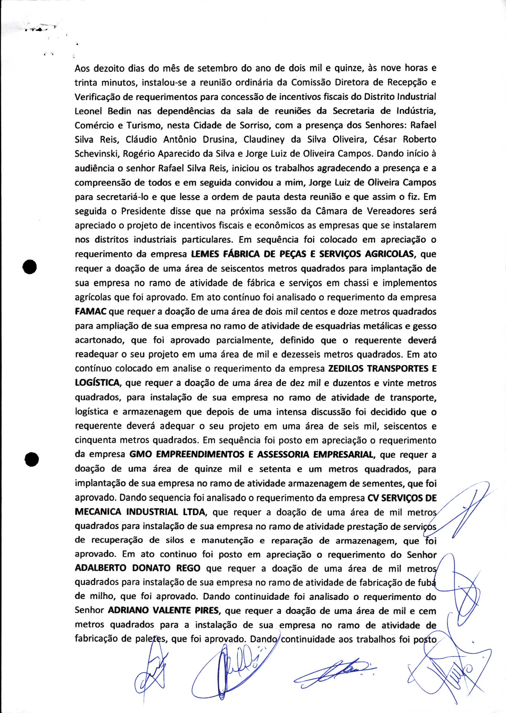 | Requerimento Nº 289/2023 | 04/10/2023 | requerendo as seguintes informações: a) Relação de todas as empresas contempladas com doação de imóveis junto ao Distrito Industrial Leonel Bedin I e II; b) Relação de todas as empresas instaladas no Distrito Industrial Leonel Bedin I que obtiveram autorização para escrituração dos imóveis, discriminadas por cumprimento do prazo e por antecipação de escritura; c) Cópias de todas as atas de reunião da Comissão Diretora de Verificação e de Recepção dos Requerimentos no período de 2017 a 2023; d) Justifica de não terem atendido a determinação do TCE/MT exarada no Acórdão nº 270/2021 – TP, vinculado ao processo nº 11.004-3/2018 explicita na alínea “h” para que o executivo apresentasse projeto de lei à Câmara Legislativa de Sorriso propondo alterações legislativas no sentido de adequar os textos normativos da Lei Municipal n.º 1.699/2008, com os ditames encartados na tese normativa e vinculativa veiculada pelo Acórdão n.º TCE/MT n.º 659/2006. |