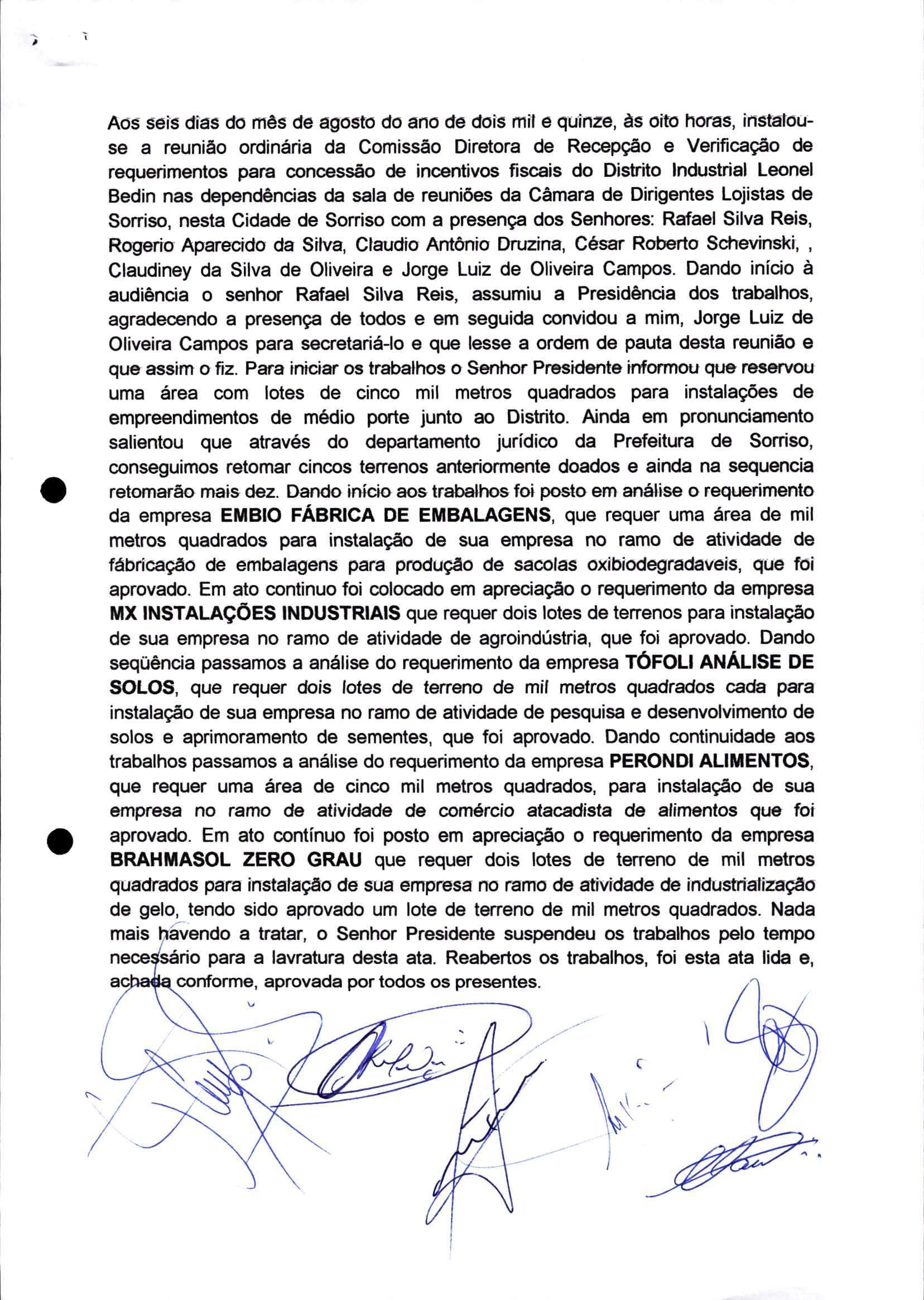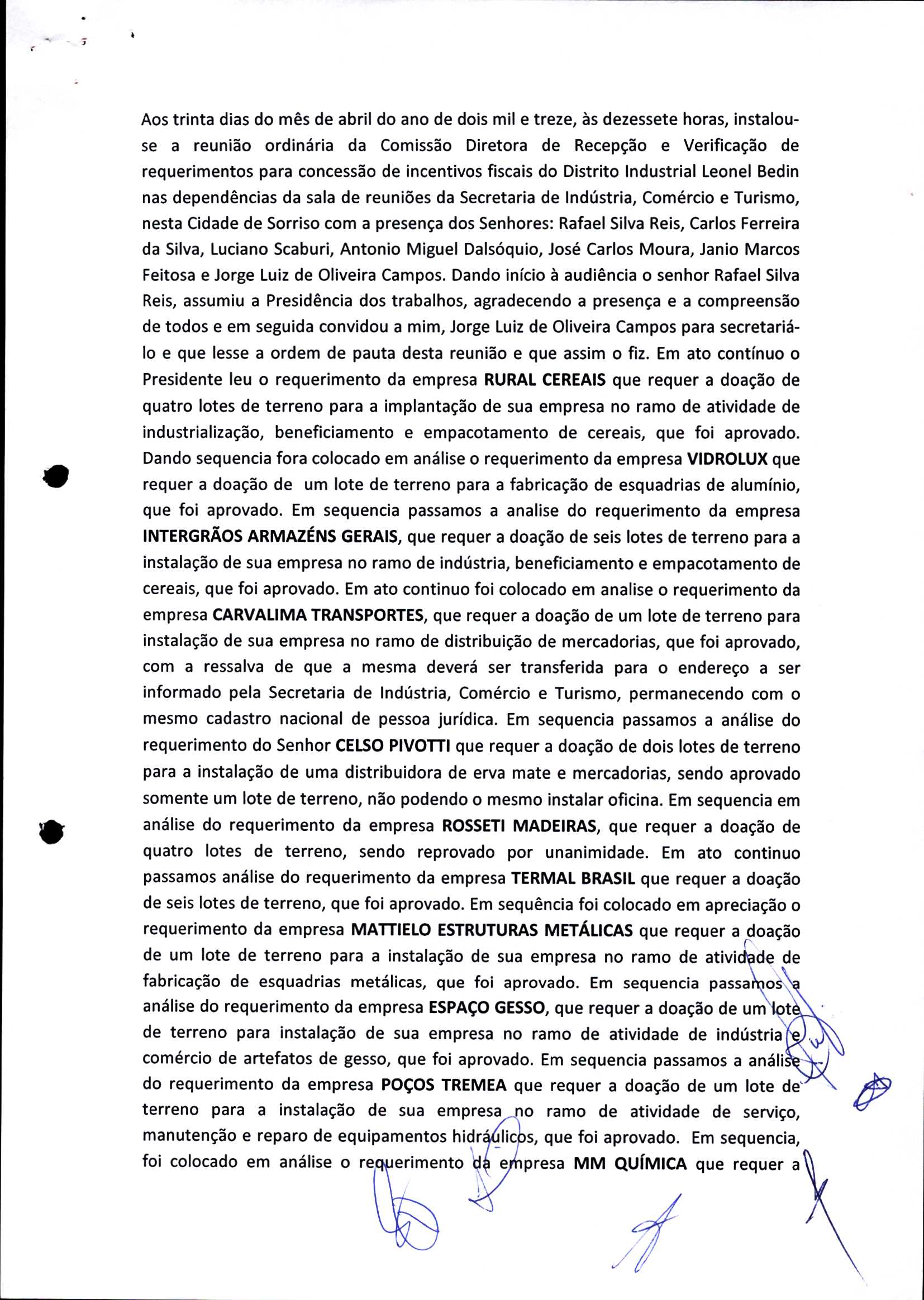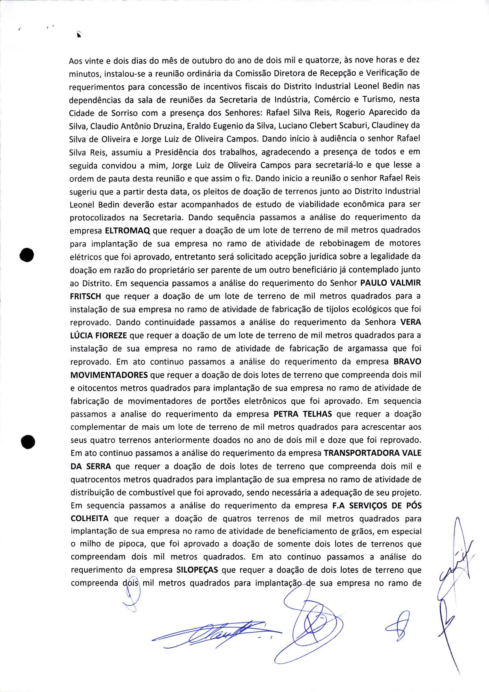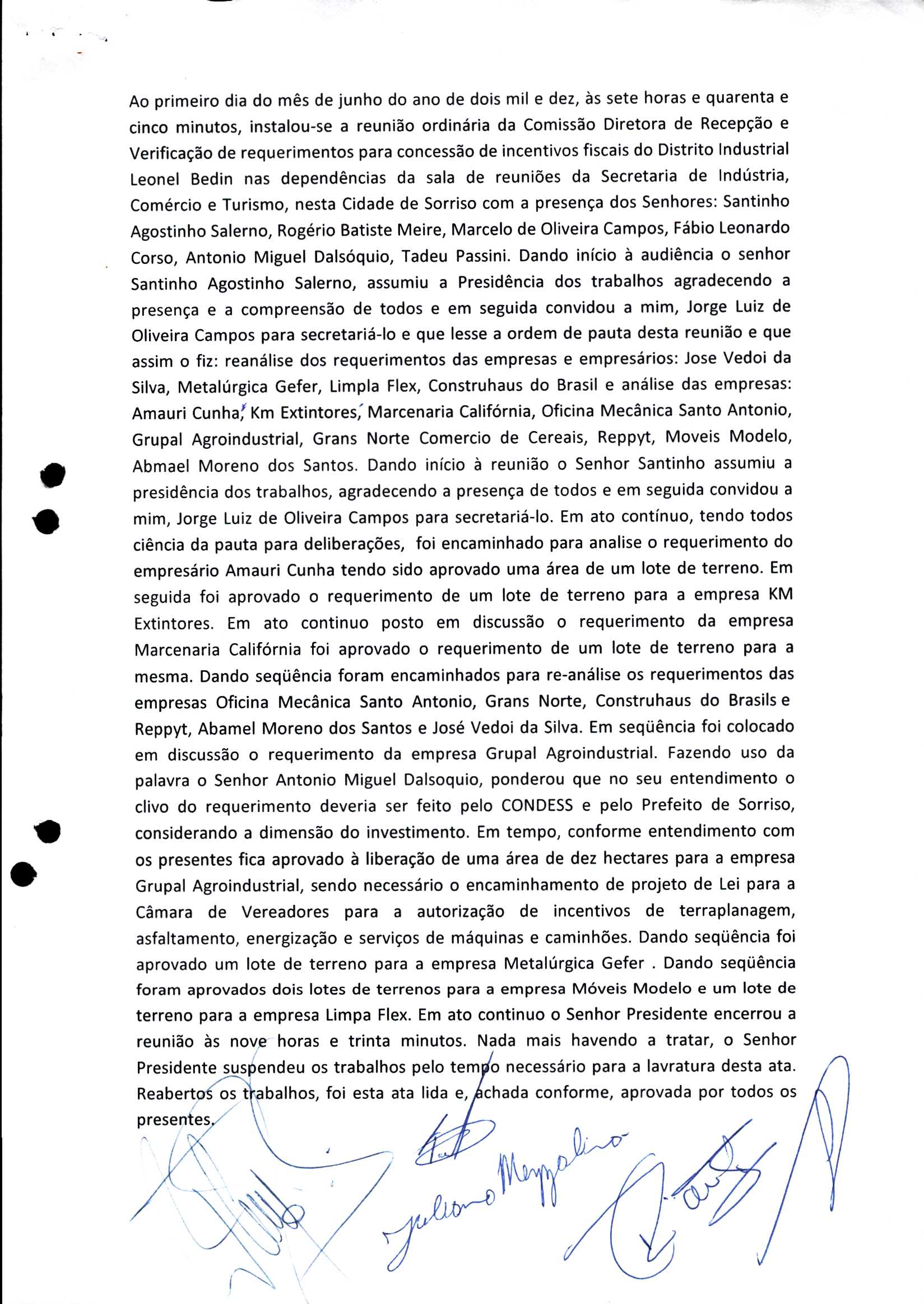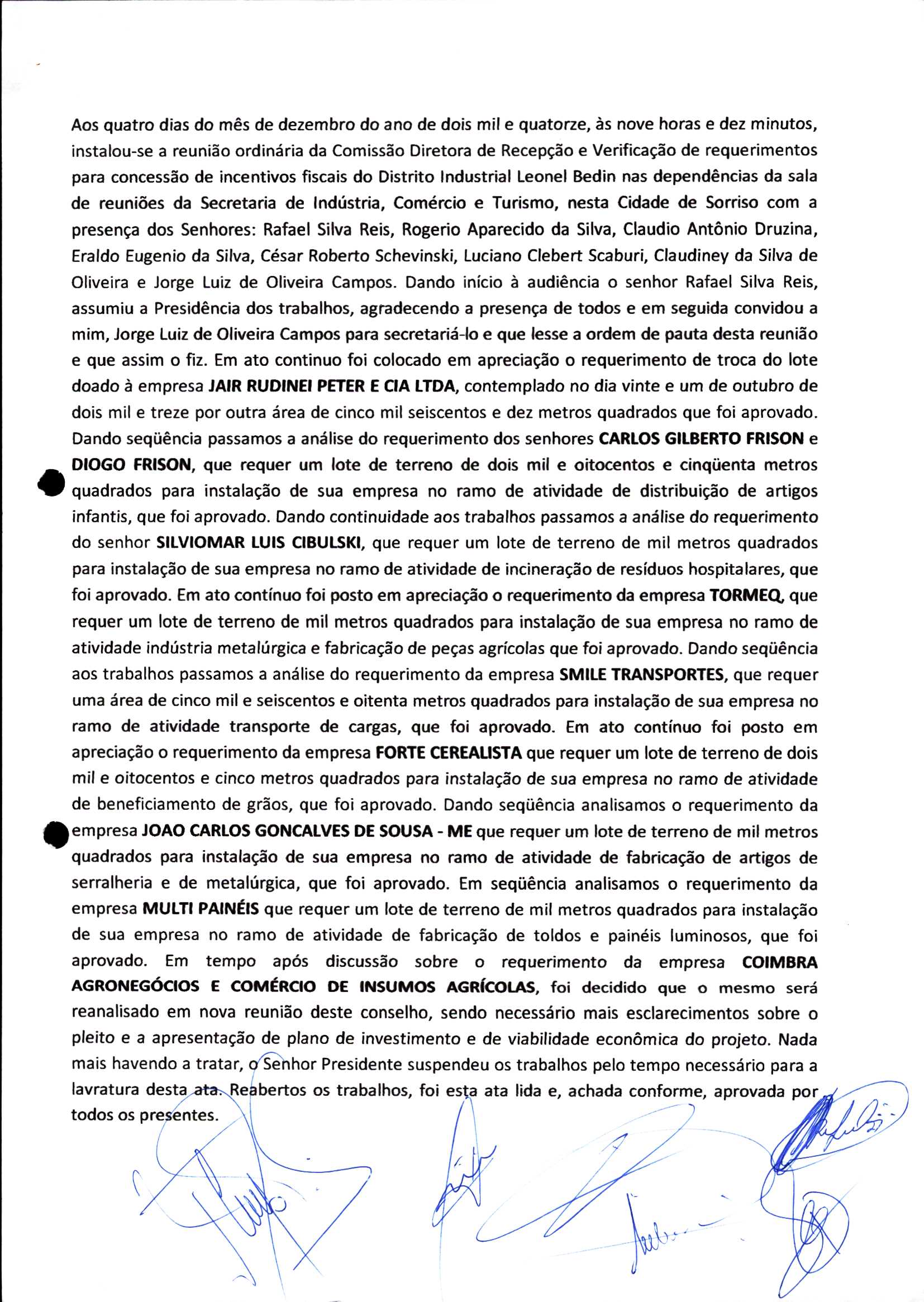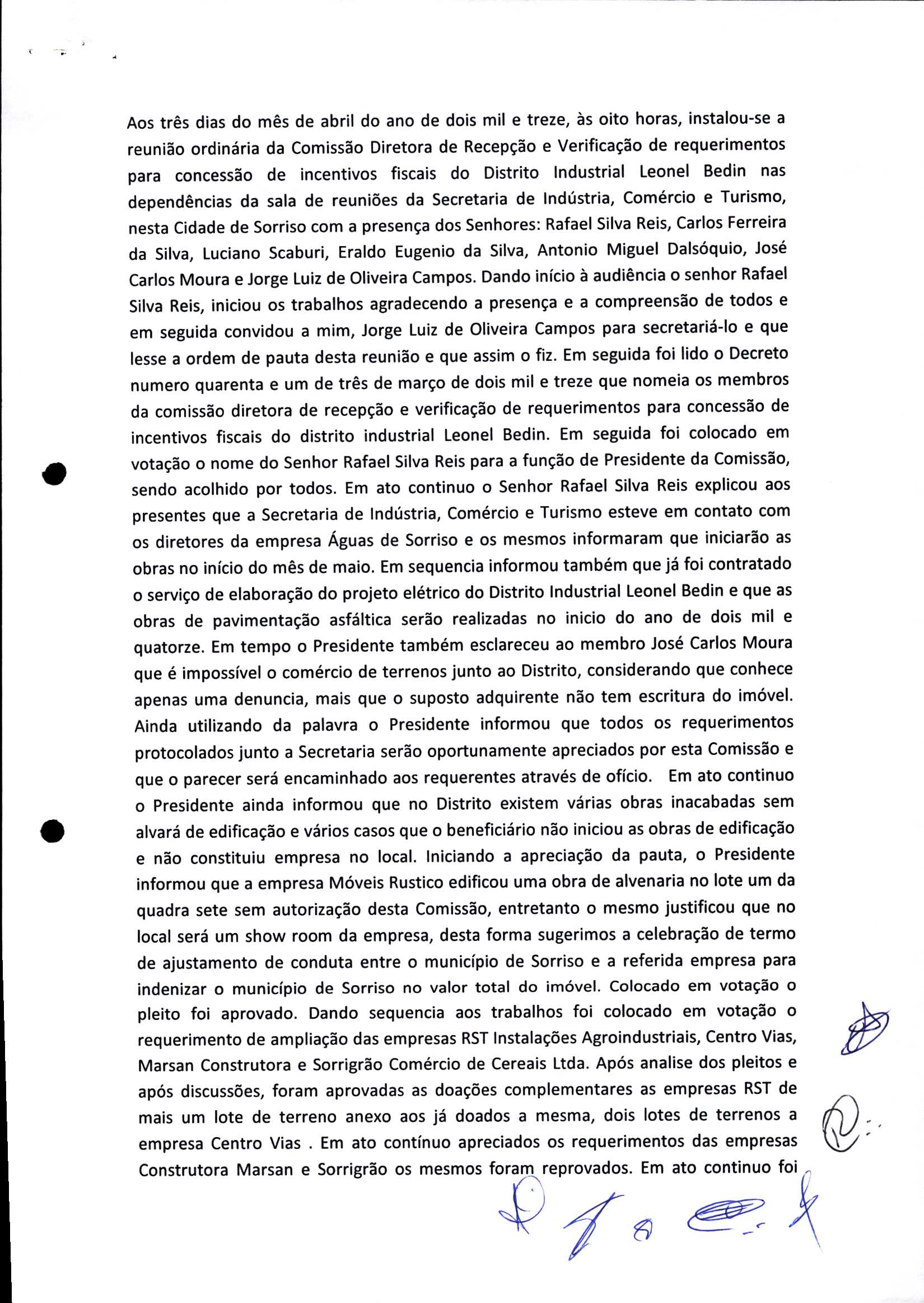 | Requerimento Nº 289/2023 | 04/10/2023 | requerendo as seguintes informações: a) Relação de todas as empresas contempladas com doação de imóveis junto ao Distrito Industrial Leonel Bedin I e II; b) Relação de todas as empresas instaladas no Distrito Industrial Leonel Bedin I que obtiveram autorização para escrituração dos imóveis, discriminadas por cumprimento do prazo e por antecipação de escritura; c) Cópias de todas as atas de reunião da Comissão Diretora de Verificação e de Recepção dos Requerimentos no período de 2017 a 2023; d) Justifica de não terem atendido a determinação do TCE/MT exarada no Acórdão nº 270/2021 – TP, vinculado ao processo nº 11.004-3/2018 explicita na alínea “h” para que o executivo apresentasse projeto de lei à Câmara Legislativa de Sorriso propondo alterações legislativas no sentido de adequar os textos normativos da Lei Municipal n.º 1.699/2008, com os ditames encartados na tese normativa e vinculativa veiculada pelo Acórdão n.º TCE/MT n.º 659/2006. |