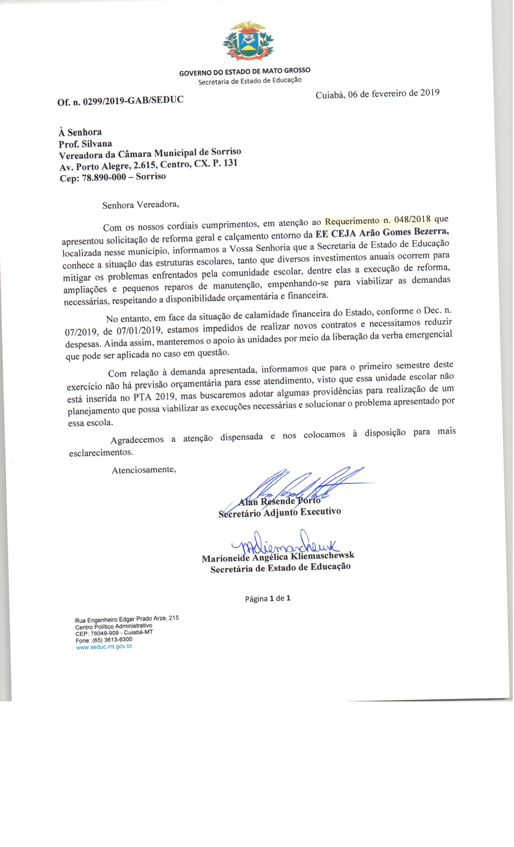 | Resposta Nº 5 ao Requerimento Nº 48/2018 | 15/01/2019 | Resposta ao Requerimento Nº 48/2018 - Requer reforma geral, construção de calçamento ao redor da escola, acesso a portadores de necessidades especiais e uma quadra poliesportiva coberta na Escola Estadual CEJA Arão Gomes Bezerra, no município de Sorriso/MT. | |