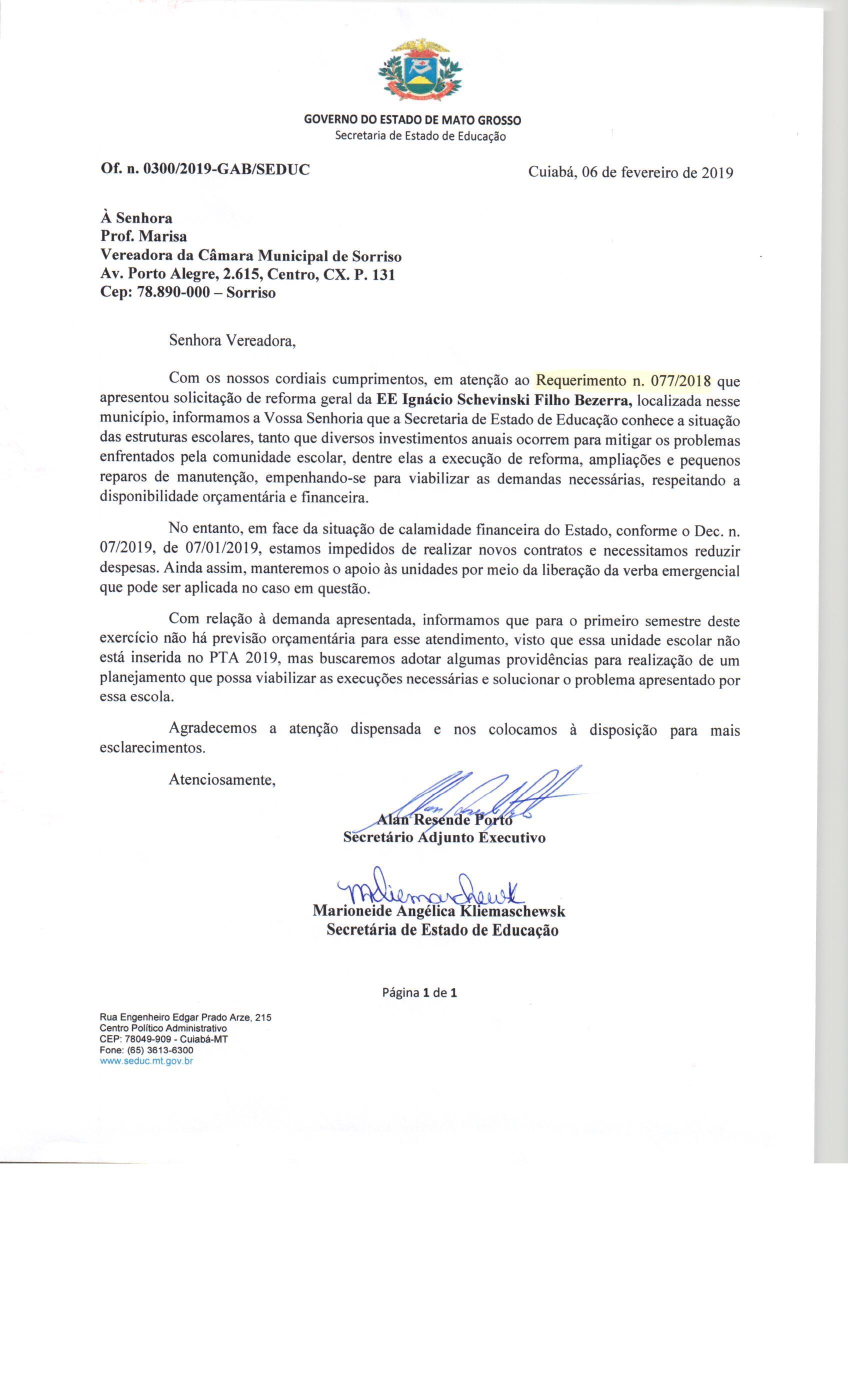 | Resposta Nº 3 ao Requerimento Nº 77/2018 | 18/02/2019 | Resposta ao Requerimento Nº 77/2018 - Requerendo reforma geral da Escola Estadual Ignácio Schevinski Filho, no município de Sorriso – MT. |