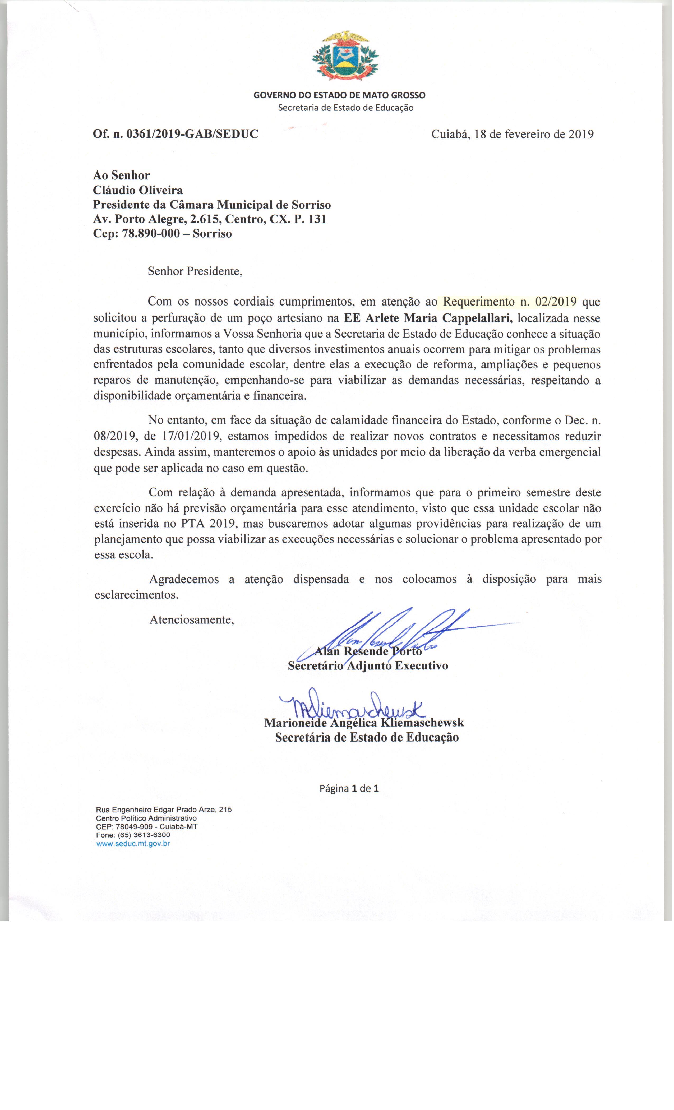 | Resposta Nº 1 ao Requerimento Nº 2/2019 | 27/02/2019 | Resposta ao Requerimento Nº 2/2019 - Requerendo a perfuração de um poço artesiano na Escola Estadual Arlete Maria Cappellari, no município de Sorriso – MT: | |