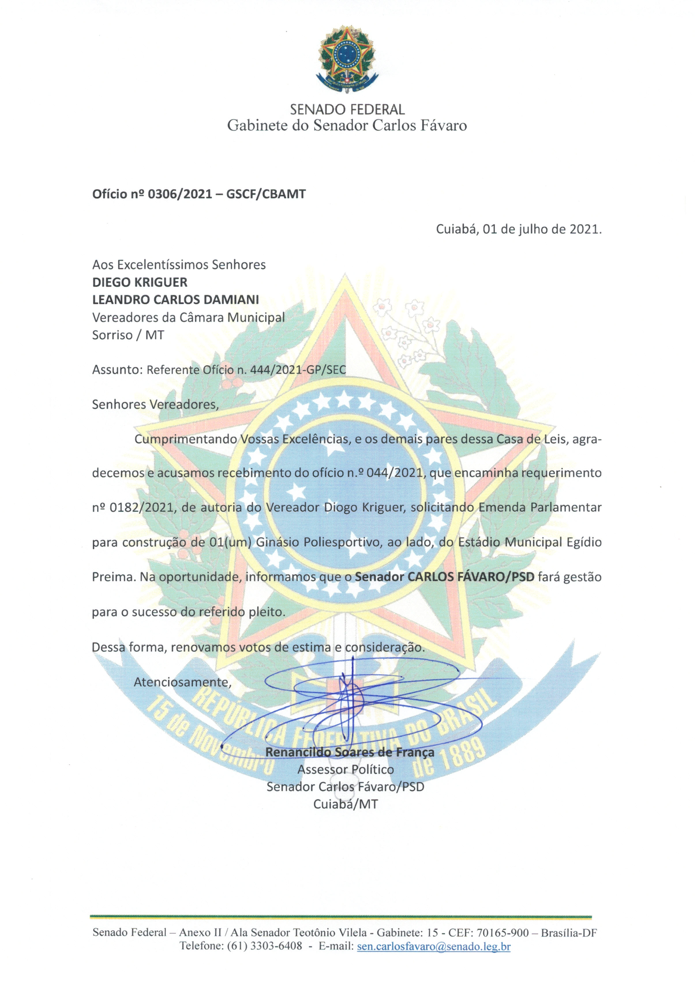 Assunto: DIOGO KRIGUER – PSDB, vereador com assento nesta Casa, em conformidade com os Artigos 118 e 121 do Regimento Interno, no cumprimento do dever, REQUER à Mesa, que esse Expediente seja encaminhado ao Exmo. Sr. Carlos Fávaro, Senador, ao Exmo. Sr. Neri Geller, Deputado Federal ao Exmo. Sr. Alberto Machado, Secretário de Cultura Esporte e Lazer do Estado do Mato Grosso, com cópia ao Exmo. Sr. Ari Lafin, Prefeito Municipal de Sorriso e para a Secretaria Municipal de Esporte e Lazer, requerendo recursos, através de Emendas Parlamentares, para a construção de um ginásio poliesportivo, ao lado do Estádio Municipal Egídio Preima, no município de Sorriso – MT.